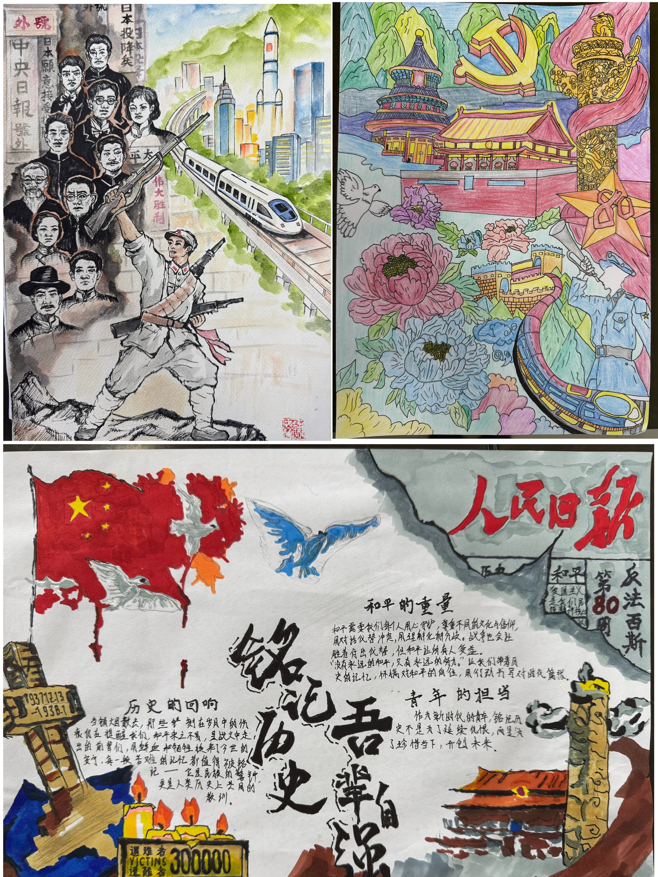 自活动开展以来,全院学生积极报名、踊跃参与,创作热情高涨。参展作品形式多样,内容丰富。有的同学聚焦“英雄赞歌”,以细腻笔触勾勒英雄面孔,再现他们在烽火岁月中的坚毅与牺牲;有的定格“历史瞬间”,重现抗战场景,让观者仿佛置身历史现场;有的描绘“和平愿景”,以飞翔的和平鸽、蔓延的橄榄枝,表达对未来的美好期许。