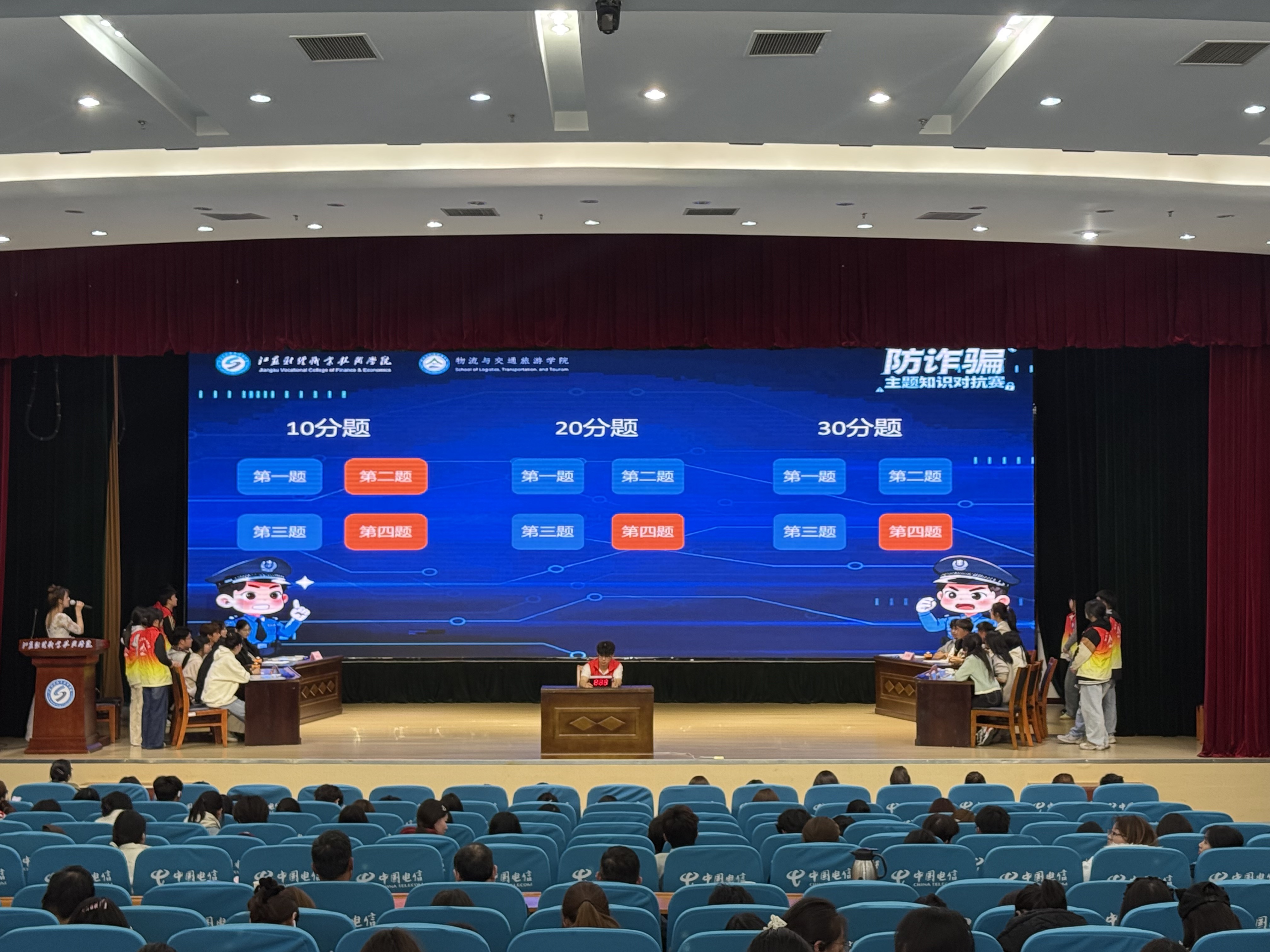 出席本次对抗赛的领导,分别是关工委委员、原科技处副处长何秀贤老师,党委保卫部副部长、保卫处副处长马鸣老师,物流与交通旅游学院党总支书记何振华老师,金融学院党总支副书记汤筱娴老师,物流与交通旅游学院党总支副书记孟英伟老师。赛前,主持人详细解读比赛规则,确保赛事公平公正。整场比赛分为必答题、抢答题、风险题三轮,另设加赛环节应对分数相同情况。计分环节由专人负责,每组配备2位计分员,全程记录各队伍得分,保障赛事流程规范透明。