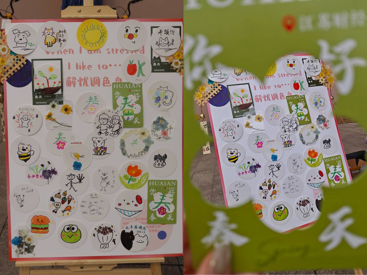 解忧调色盘创作区里,同学们手持调色盘卡纸与画笔,将内心的压力与解压秘诀以绘画、图案、文字结合的形式尽情表达,展示板上的作品形成了一面充满温暖与力量的“解忧墙”。大家交流解压心得,在分享与互动中传递温暖,让负面情绪有了出口,也让积极的心理能量在校园中传递。