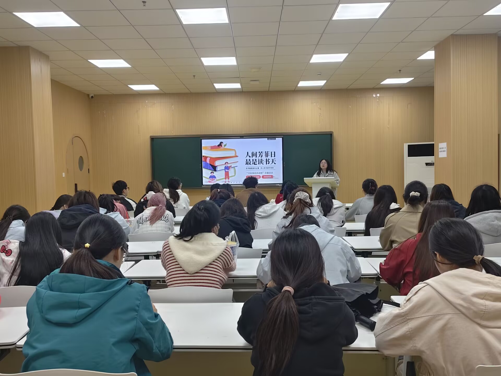 活动伊始,杨梦茹老师从天时、地利、人和三个维度,生动阐释“四月正是读书天”的深意:天时恰逢春和景明、万物生长,正是静心读书、汲取知识的好时节;地利坐拥校园书香环境,为阅读提供良好氛围;人和则是同学们相聚一堂,以书会友、共同成长。杨老师向全体同学发出阅读倡议,鼓励大家珍惜春光,在本月读完一本好书,让阅读成为日常习惯。