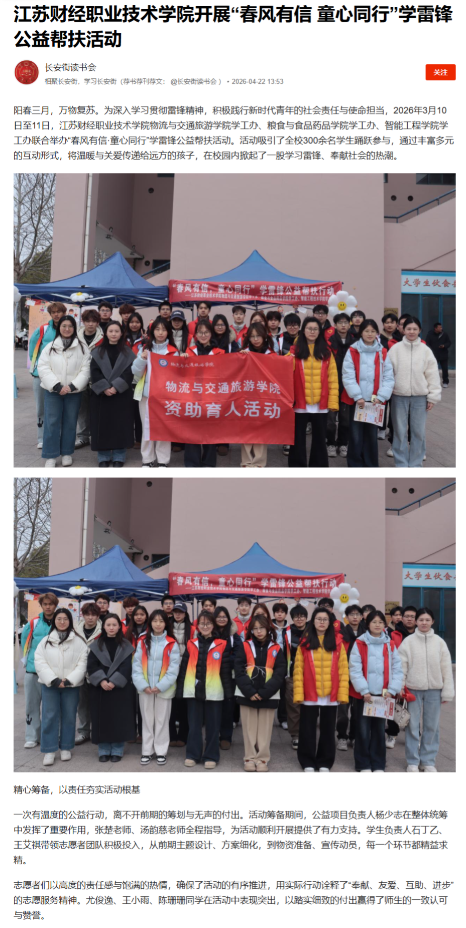 【人民日报-人民号】江苏财经职业技术学院开展“春风有信 童心同行”学雷锋公益帮扶活动