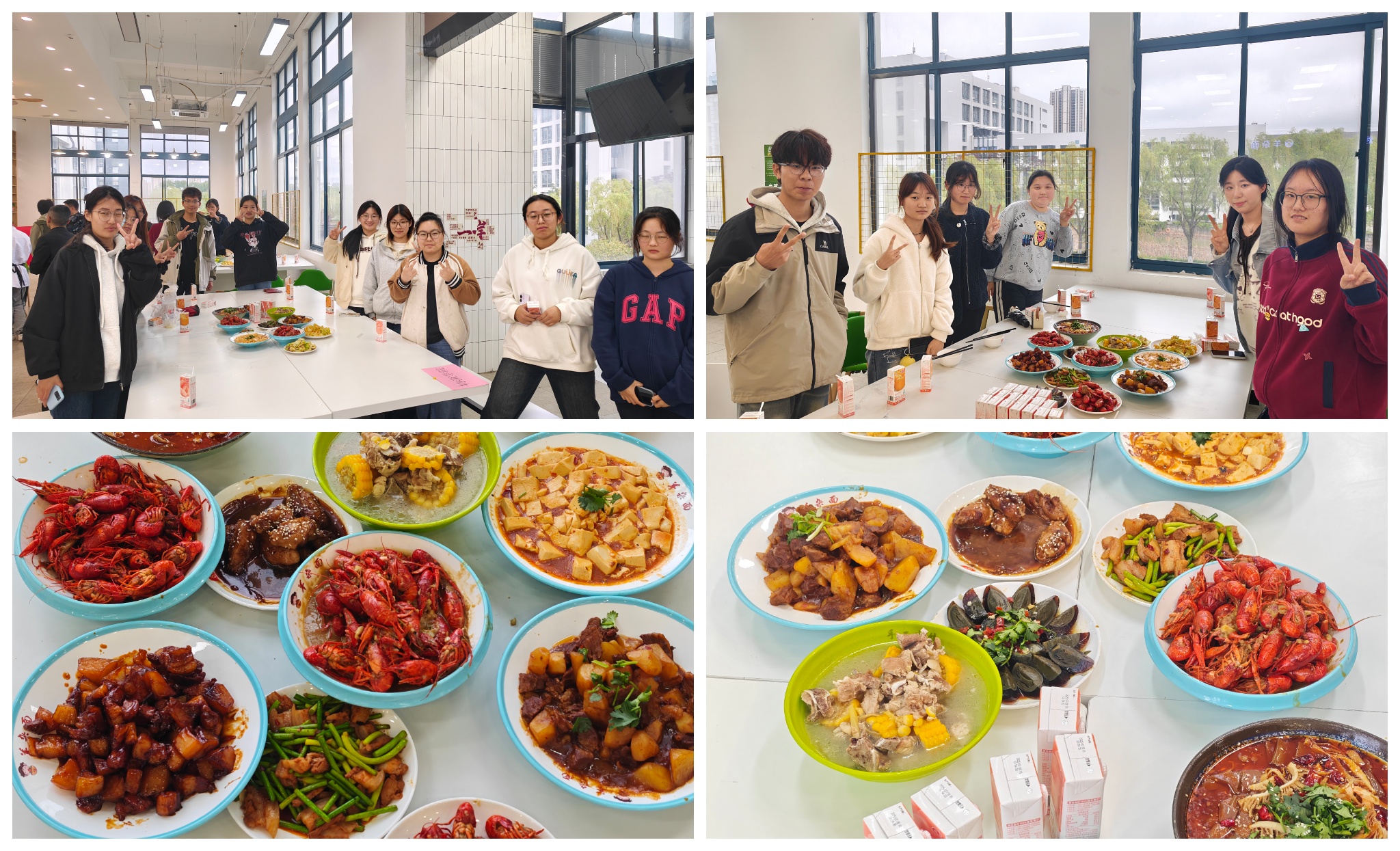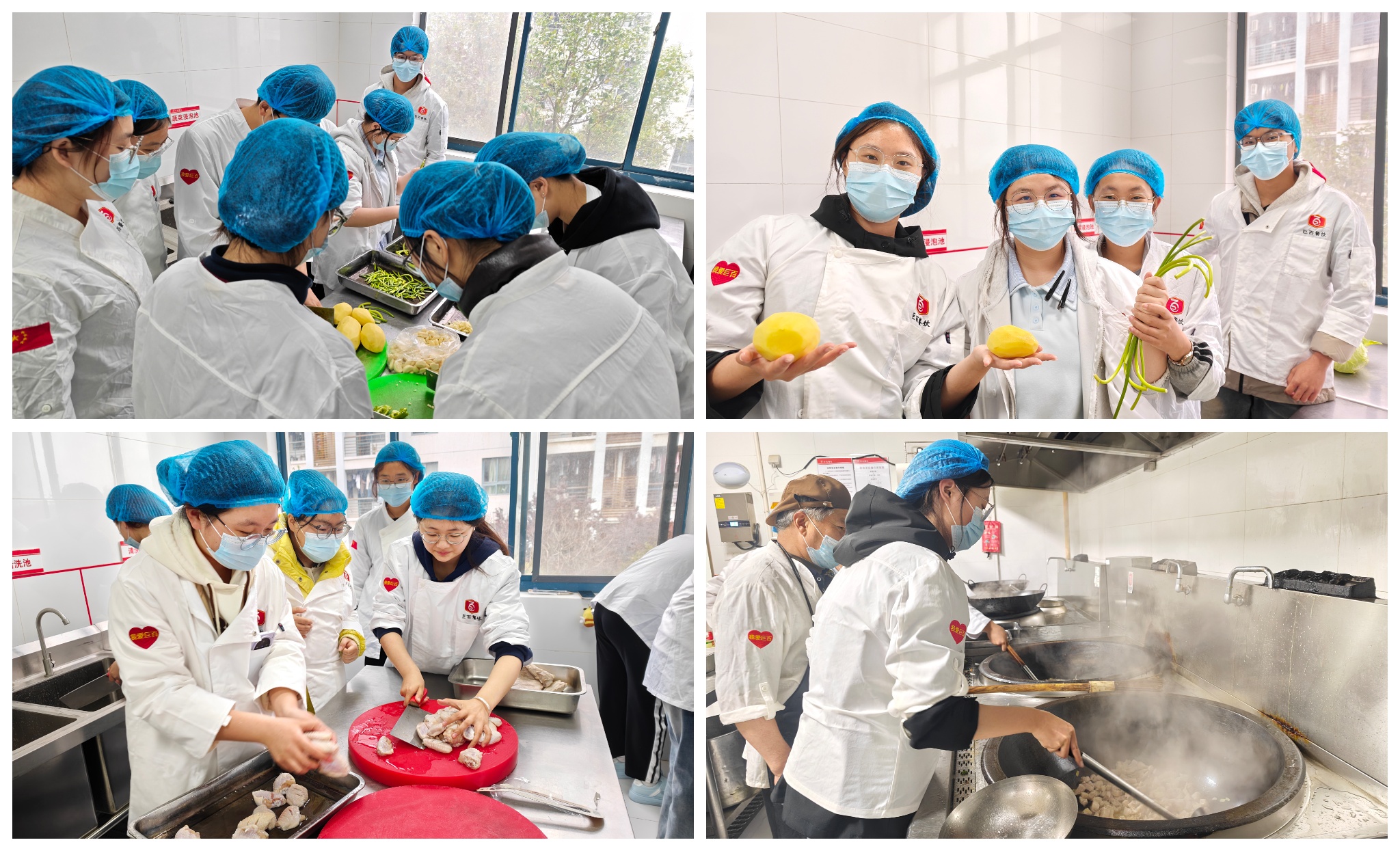 观摩环节结束后,厨艺实践正式拉开序幕。同学们以小组为单位分工协作,各司其职、默契配合。有的专注切配肉块,刀工虽显青涩却格外认真;有的细致清洗小龙虾,确保食材干净卫生;有的精心准备葱姜蒜等辅料,为烹饪做好充分铺垫,现场秩序井然、干劲十足。25 航空物流 1 班的卞淑婷同学率先登场,将肉块倒入大锅,在餐厅大厨的专业指导下,熟练掌握翻炒技巧、火候把控和调味比例,一道色泽红亮、香气四溢的红烧肉率先出锅,赢得现场阵阵赞叹。随后,同学们依次上阵,在大厨的悉心点拨下,一道道菜品陆续完成,每道菜都做到了色香俱全,充分展现了同学们的学习能力与实践热情。