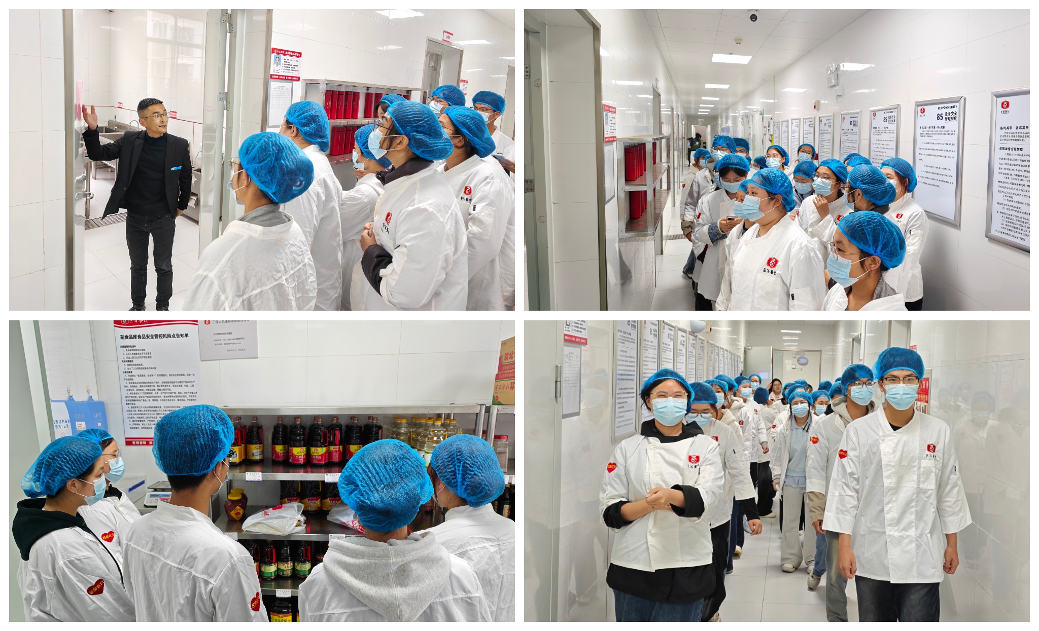随后,适园餐厅孙经理带领同学们开启了后厨“深度探秘”之旅。从信息公示展示区的资质公示,到餐厅配套休闲区的环境打造;从洗消区的标准化消毒流程,到智能留样柜的精准管控;从分类清晰的蔬菜加工区、荤菜加工区,到规范存储的冰箱存储间、库房,再到繁忙有序的厨房间、蒸煮间,最后到严格把控的原料验收区,孙经理全程细致讲解各区域的功能定位、操作规范和卫生标准。同学们认真聆听、不时提问,亲眼见证了校园餐饮从原料入库到餐桌呈现的全链条规范化管理,深刻感受到后厨工作的卫生严谨与科学高效。